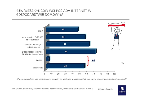 Ericsson Consumer Lab przeprowadził w 2009 roku kompleksowe badanie polskiego rynku teleinformatycznego z którego wynika, że ponad połowa Polaków posiada w swoich domach dostęp do Internetu.