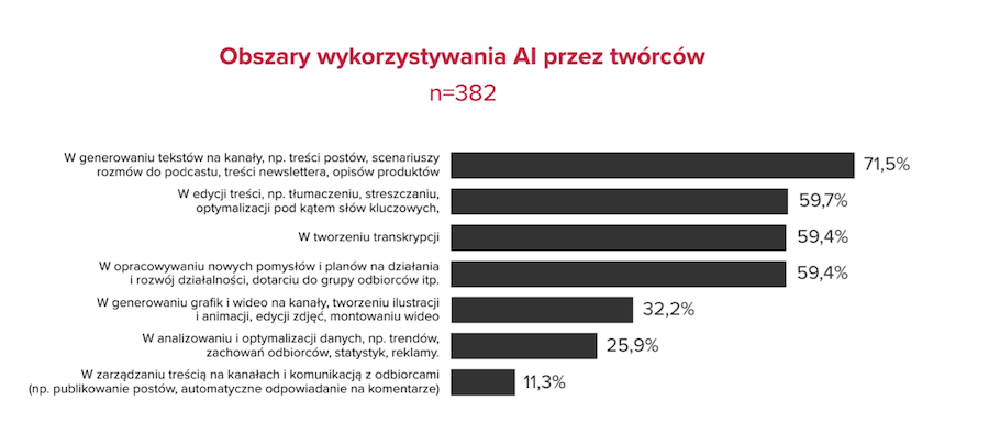 @lilmiquela, @fit_aitana czy @shudu.gram to tylko kilka przykładów wirtualnych influencerów, czyli postaci stworzonych przy użyciu AI. Choć śledzi je setki tysięcy osób i tego typu kont ciągle przybywa, to jednak nadal skrajne przypadki używania sztucznej inteligencji w branży. Twórcy najczęściej wykorzystują sztuczną inteligencję do tworzenia treści – postów, scenariuszy, newslettera – oraz szukania pomysłów na nowe materiały. Sztuczna inteligencja wspiera też w transkrypcji, analizie i edycji materiałów, odciążając twórców w najbardziej czasochłonnych etapach pracy. Rzadziej AI służy do generowania grafik, wideo czy analizy danych, a tylko 11 proc. badanych automatyzuje za pomocą AI publikację postów lub odpowiadanie na komentarze.