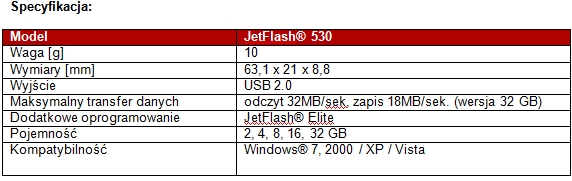 Sugerowana cena przenośnej pamięci JetFlash 530 o pojemności 2 GB wynosi 27 zł brutto, 4 GB – 37 zł brutto, 8 GB – 67 zł brutto, 16 GB – 131 zł brutto, a 32 GB – 295 zł brutto. Wszystkie urządzenia objęte są dożywotnią gwarancją producenta.